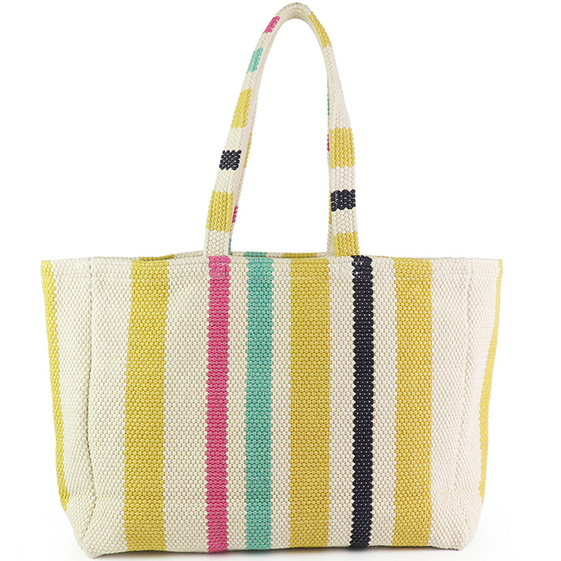 Beach bag in 100% woven cotton with multi coloured stripes.