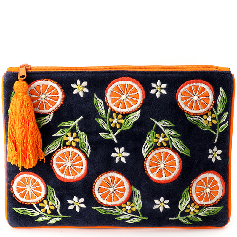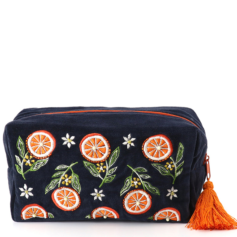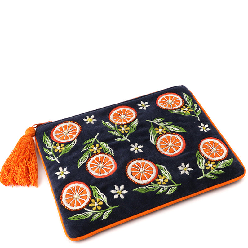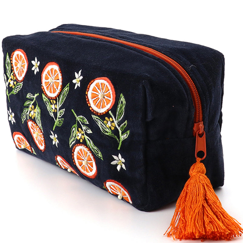 (a41) P.O.M. Blue Orange Velvet Embroidered Cosmetic Bag