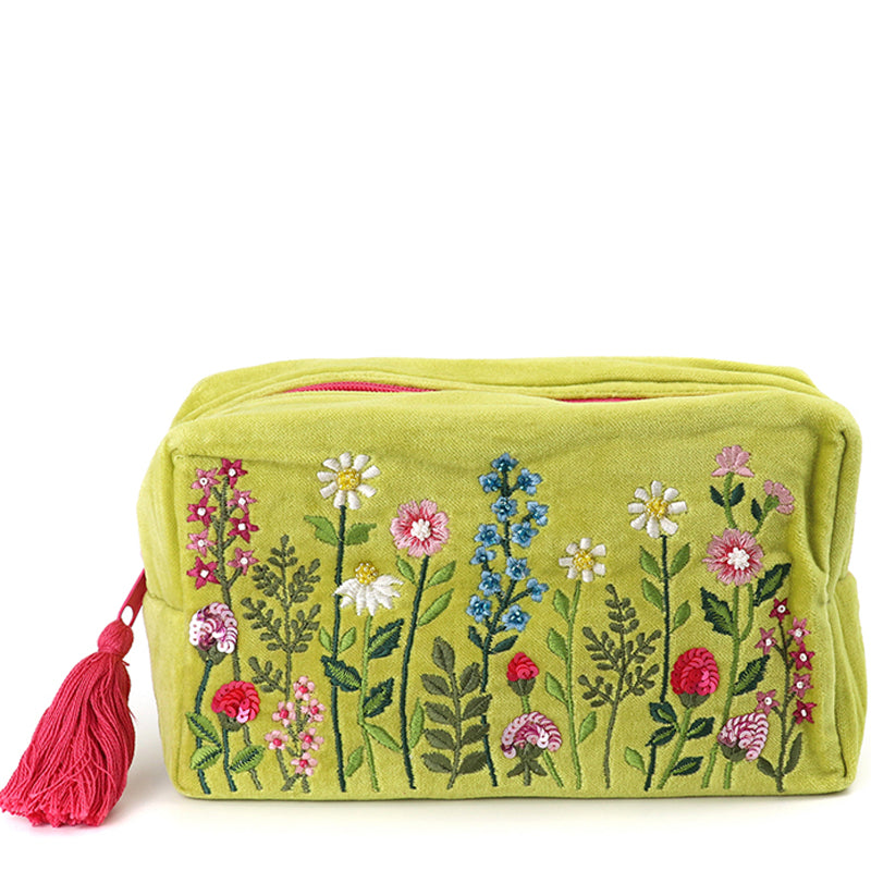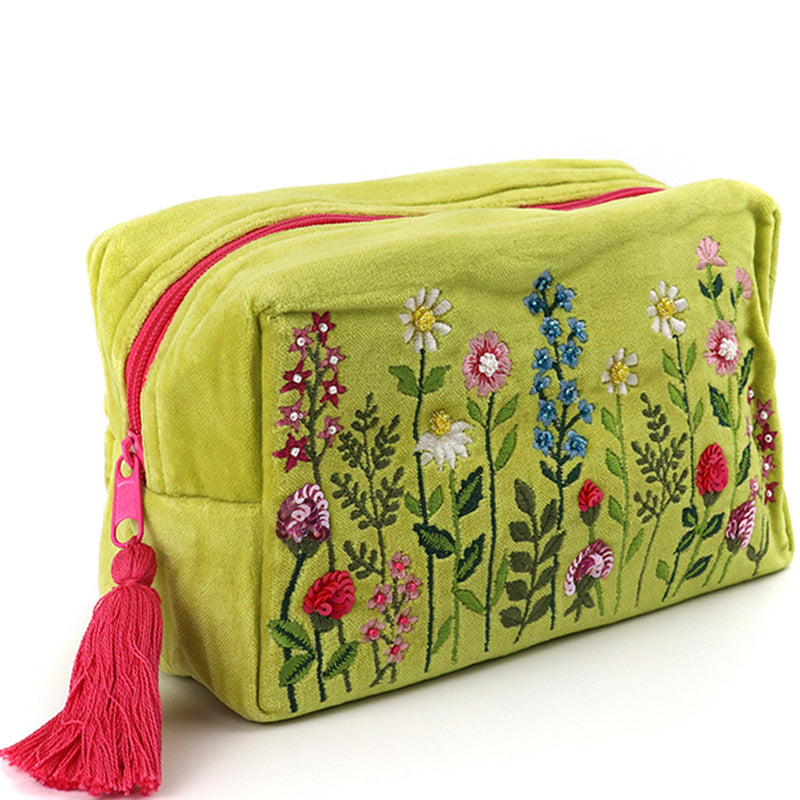 Cotton velvet cosmetic bag with embroidered meadow flower scene and tassel zip pulley.