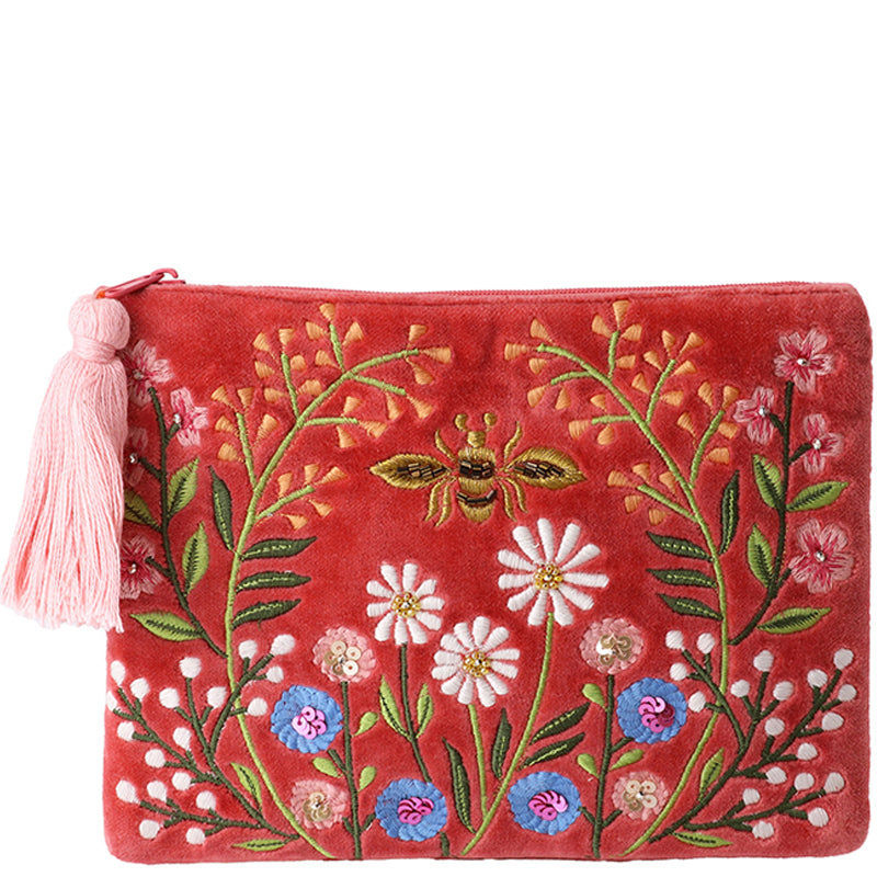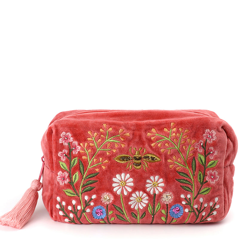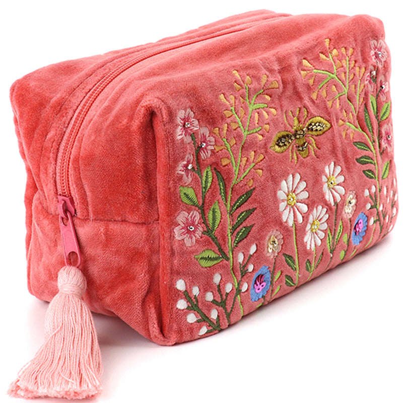 (a40) P.O.M. Coral Velvet Embroidered Cosmetic Wash Bag