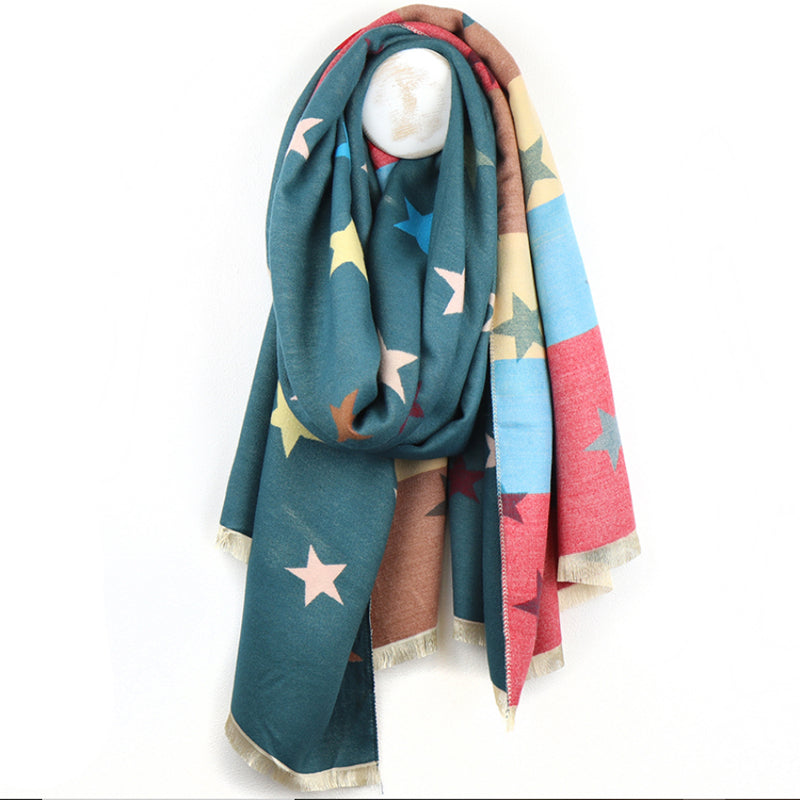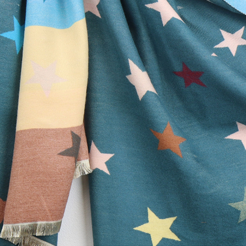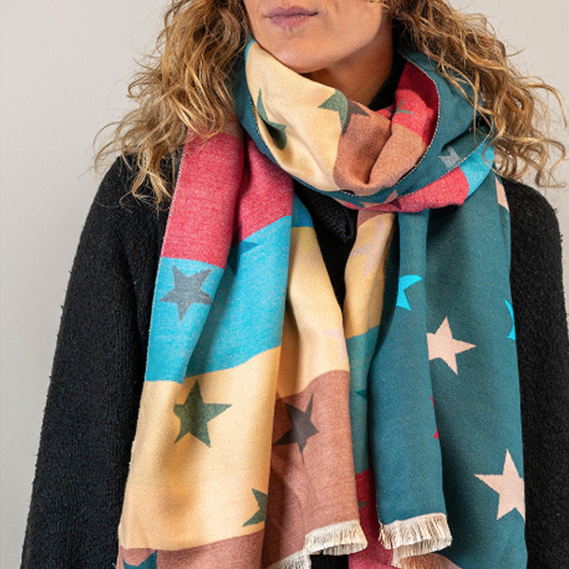 Gorgeous teal multicoloured all over star patterned all season soft touch long scarf.