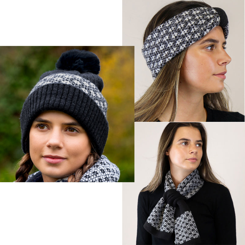 (.a) Scandi Hat Scarf Headband Set Black White 3 Pieces